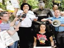 Yüksel Caddesi’ndeki İnsan Hakları Anıtı önünde toplanan Cumhuriyet  Gazetesi Okurları, Çağdaş Gazeteciler Derneği ve Cumhuriyet Kadınları Derneği üyeleri sloganlar atıp, dövizler taşıdı.