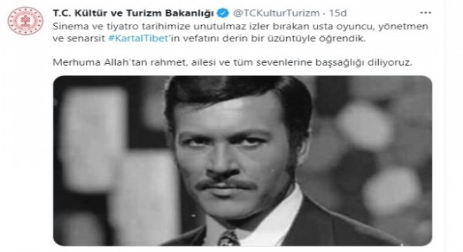 Kültür ve Turizm Bakanlığı'ndan yapılan açıklamada, ''Sinema ve tiyatro tarihimize unutulmaz izler bırakan usta oyuncu, yönetmen ve senarsit Kartal Tibet’in vefatını derin bir üzüntüyle öğrendik. Merhuma Allah’tan rahmet, ailesi ve tüm sevenlerine başsağlığı diliyoruz.'' ifadesi kullanıldı.